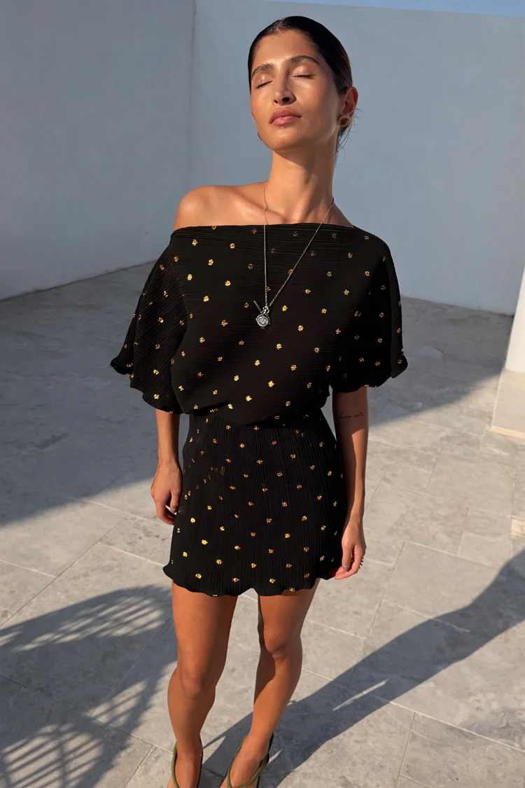 A re-edition of our bestselling Plisse Tilly dress in a brand new mini silhouette. Made with a plisse fabric, hundreds of tiny little pleats and an elasticated waistband means it has extra give, super comfortable fit and is perfect for bump dressing. Speckled with little gold metallic dots that are highlighted by the sunshine, it's a suitcase staple.Â