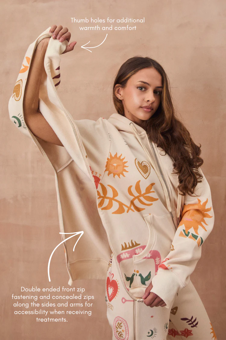 In a gorgeous cream, featuring a double ended front zip fastening and concealed zips along the sides and arms for accessibility when receiving treatments.Â
