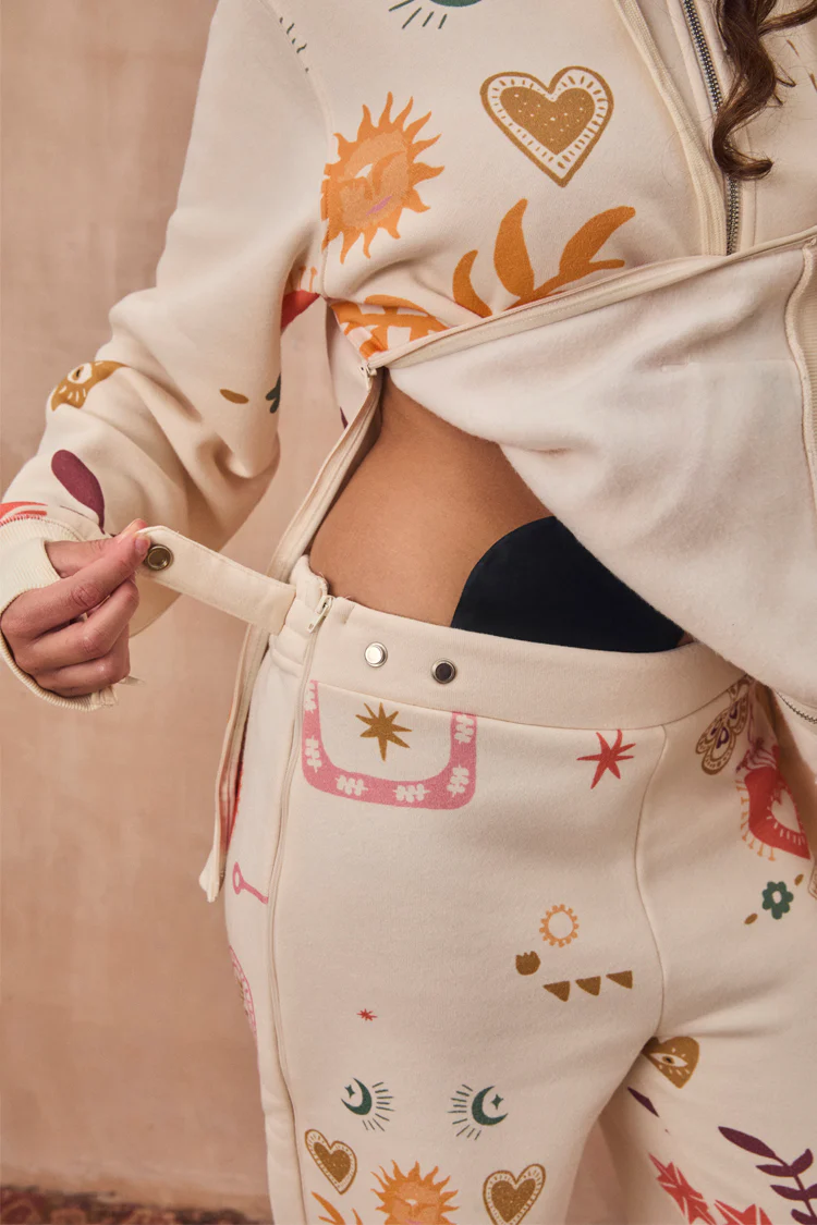 In a gorgeous cream decorated with our iconic NFD print motifs, embellished with our logo and featuring concealed double ended zips along the sides and an adjustable waistband with poppers for accessibility when receiving treatments.Â