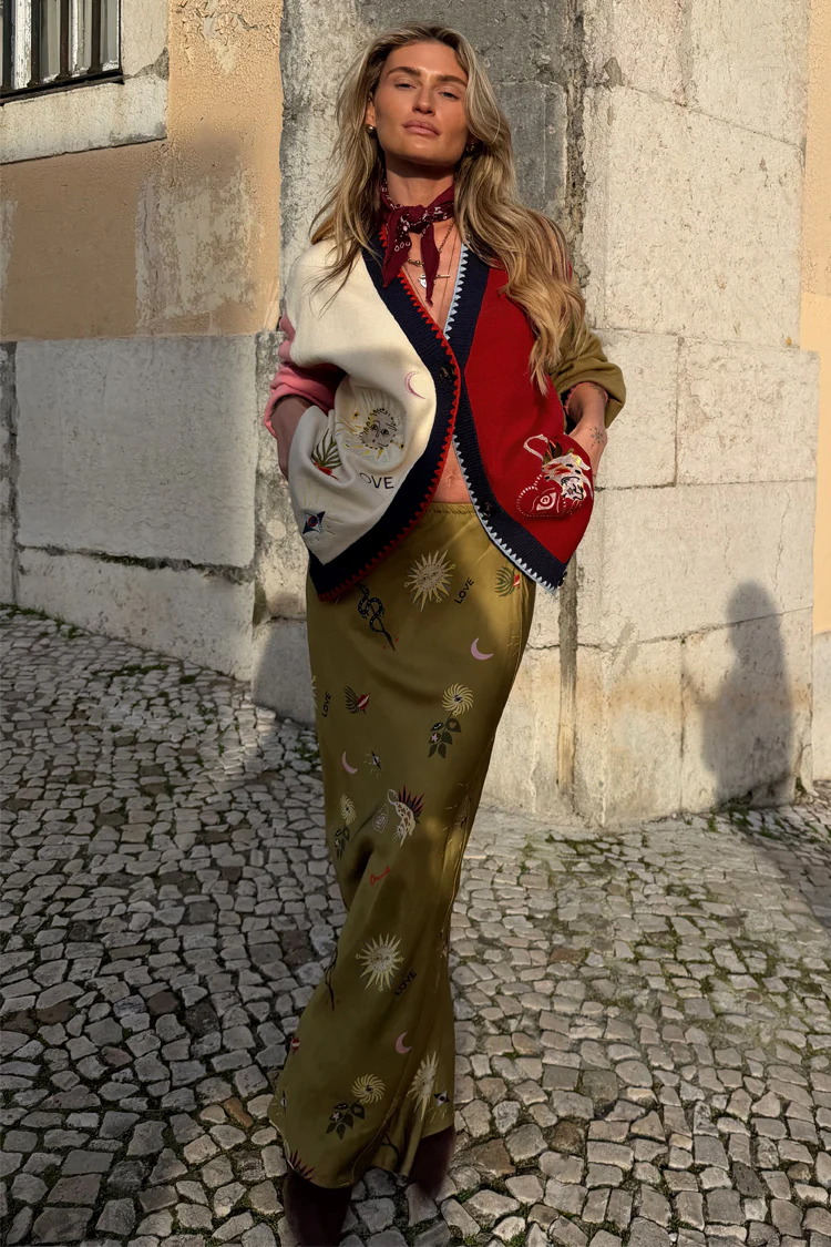 Our classic dorris silhouette in a new edition of our mystical print, featuring elevated versions of iconic NFD motifs! The relaxed silhouette allows you to style with ease, whether it's with a casual tee, swimwear for a stroll along the beach or paired with the mystical cardigan and heels for a soft night out look.Â