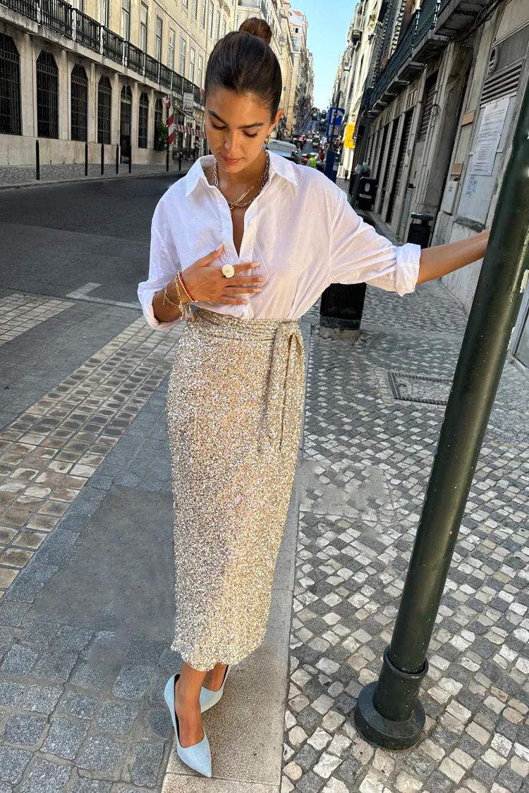 From festival season to wedding guest glamour, sequin is always a good option. Made from intricate silver sequin discs that catch the sunlight, in our classic Jaspre shape, with an adjustable waist tie fastening that's perfect for multi-styling! Pair with your favourite basics for a casual look or dress up with a heel and clutch. All our sequin pieces are lined with a weighty satin that slinks over your figure and ensures a comfortable and non-itchy feel.